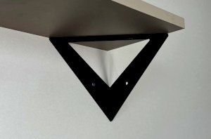Полка крепится к стене с помощью чёрных треугольных держателей, которые обеспечивают устойчивость и долговечность. Особенность модели в том, что держатели можно расположить сверху, снизу или один сверху, другой снизу, что позволяет адаптировать полку под любые интерьерные решения и потребности.