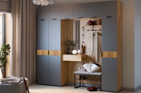 Принт, имитирующий вертикальную фрезеровку придает вешалке уникальный и современный вид, добавляя текстуру и глубину. Материал вешалки – ЛДСП, что обеспечивает прочность и долговечность, а также легкость в уходе.