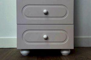 Корпус выполнен из ЛДСП толщиной 16 мм, фасад изготовлен из МДФ в плёнке ПВХ и декорирован фрезеровкой, характерной для серии Милана. Оригинальные круглые ручки и опоры завершают образ, подчёркивая аккуратный и современный дизайн мебели.